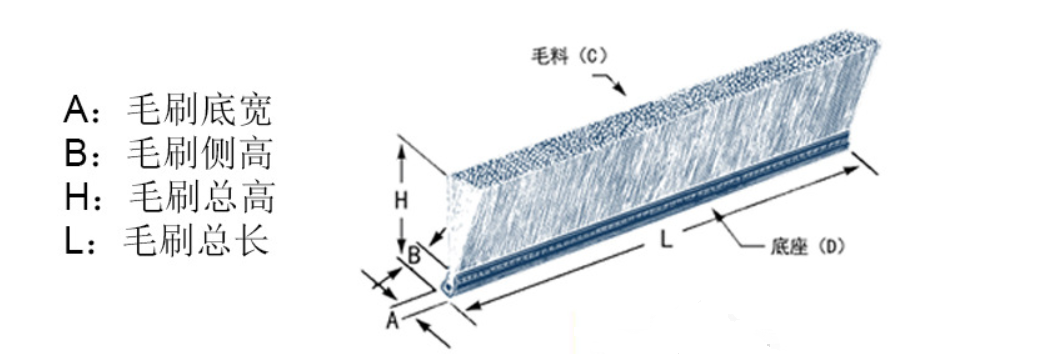 毛刷的參數(shù)有四部分組成,分別是底寬、側(cè)高、總高、總長。底寬、側(cè)高常規(guī)為3-5mm,總高常規(guī)為20-80mm,我司底寬、側(cè)高可生產(chǎn)范圍為2.5-12mm,總高可生產(chǎn)范圍為8mm-150mm,如下圖所示: